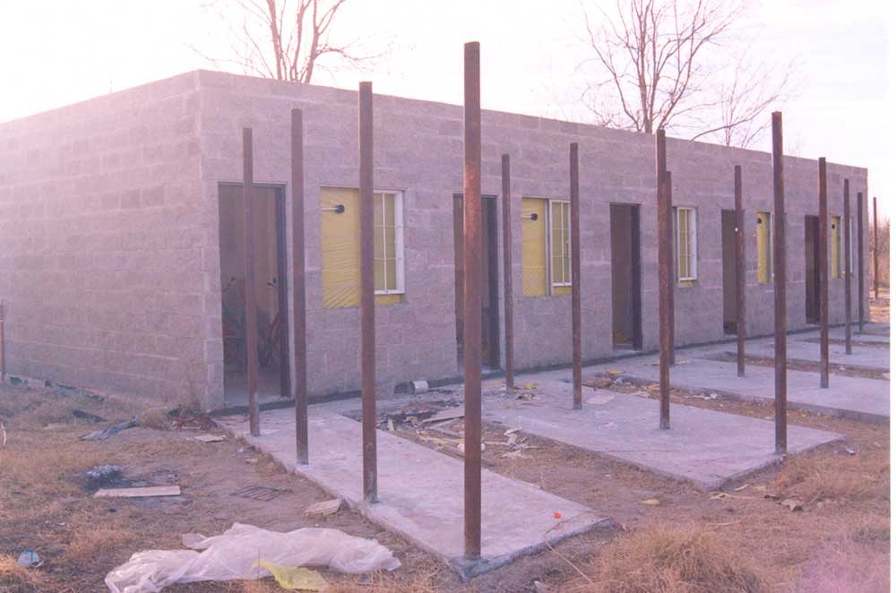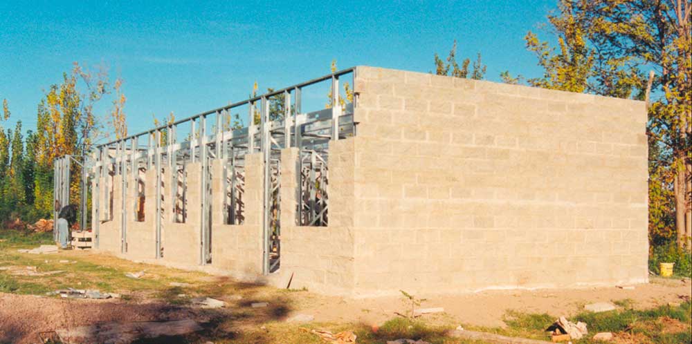 CONSTRUCCION EN STEEL FRAME. CERRAMIENTO EXTERIOR CON BLOQUES DE HORMIGON TIPO PIEDRA. TECHO PLANO. INTERIORES EN PLACA DE YESO.