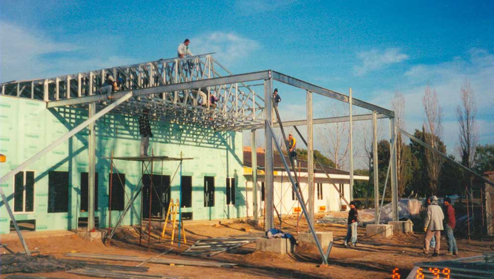 CONSTRUCCION EN STEEL FRAME. CERRAMIENTO EXTERIOR CON SIDING VINILICO. TECHO A DOS AGUAS. INTERIORES EN PLACA DE YESO.